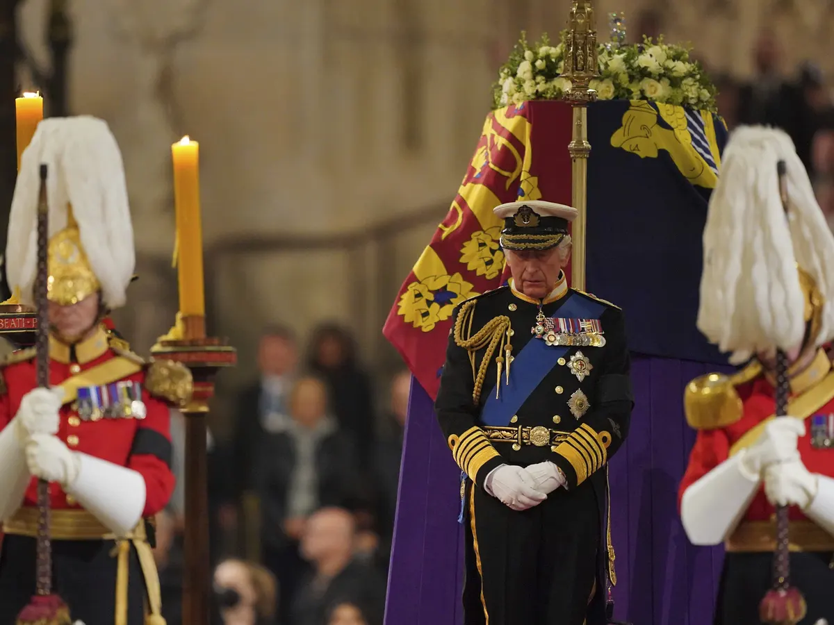 The King holds a vigil beside the coffin of Queen Elizabeth II as it lies in state in Westminster Hall. Photograph: Dominic Lipinski/AP