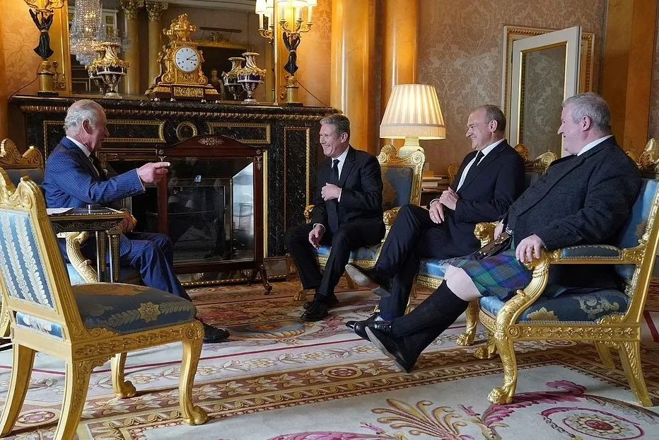The King holds an Audience of Parliamentary opposition leaders in the 1844 Room, Buckingham Palace.